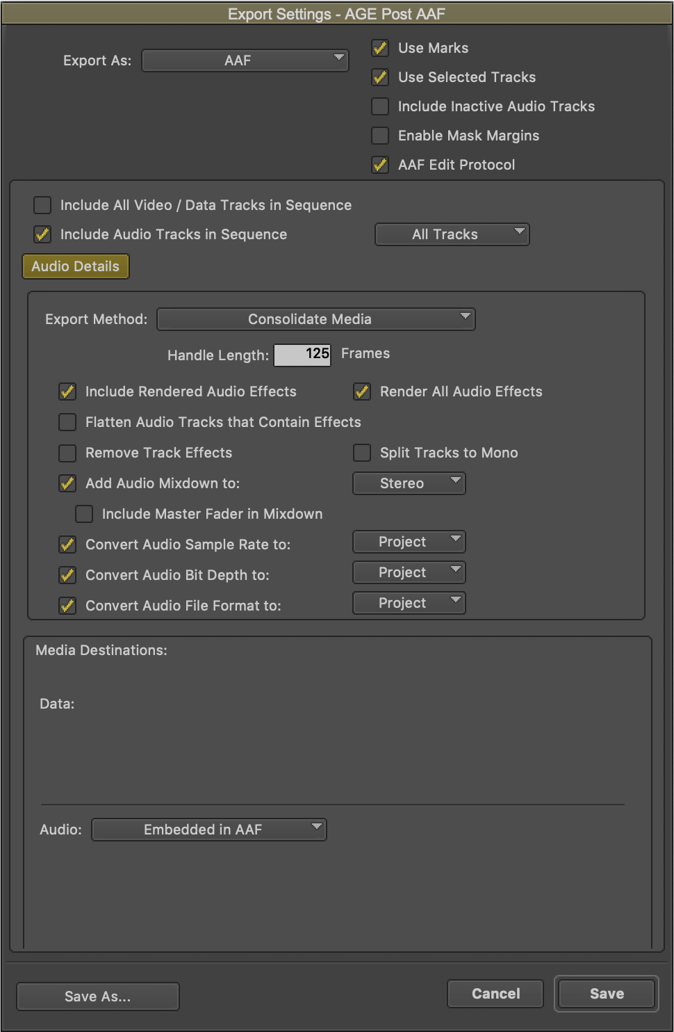 When exporting from Adobe Premiere Pro, please use the following settings in your 'AAF Export Settings' window: